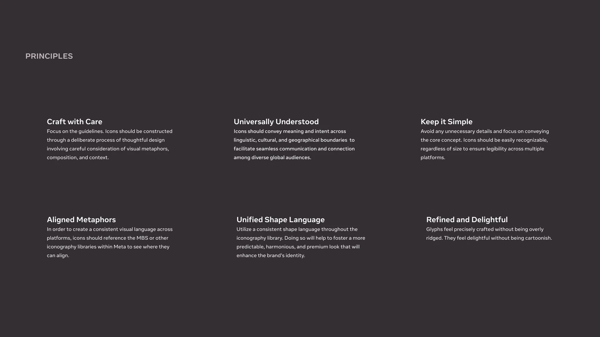 The initial planning phase focused on defining core principles for the new icon system—what was missing from the existing sets, and which qualities we wanted to prioritize moving forward. These principles became our north star, guiding creative decisions and helping us clearly communicate intent to design leadership.